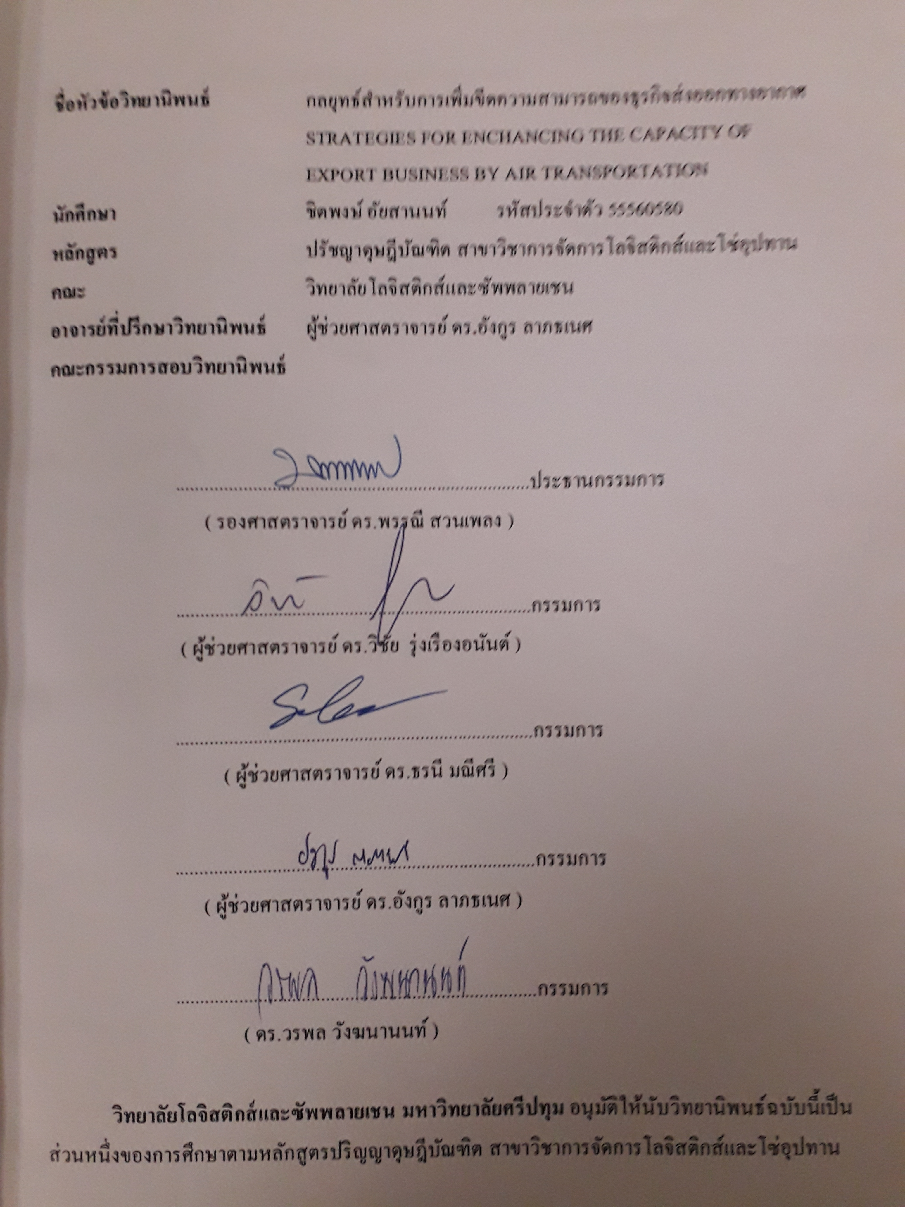 ชิตพงษ์ อัยสานนท์. 2561. "กลยุทธ์สำหรับการเพิ่มขีดความสามารถของธุรกิจส่งออกทางอากาศ." วิทยานิพนธ์ปรัชญาดุษฎีบัณฑิต สาขาวิชาการจัดการโลจิสติกส์และโซ่อุปทาน วิทยาลัยโลจิสติกส์และซัพพลายเชน มหาวิทยาลัยศรีปทุม.