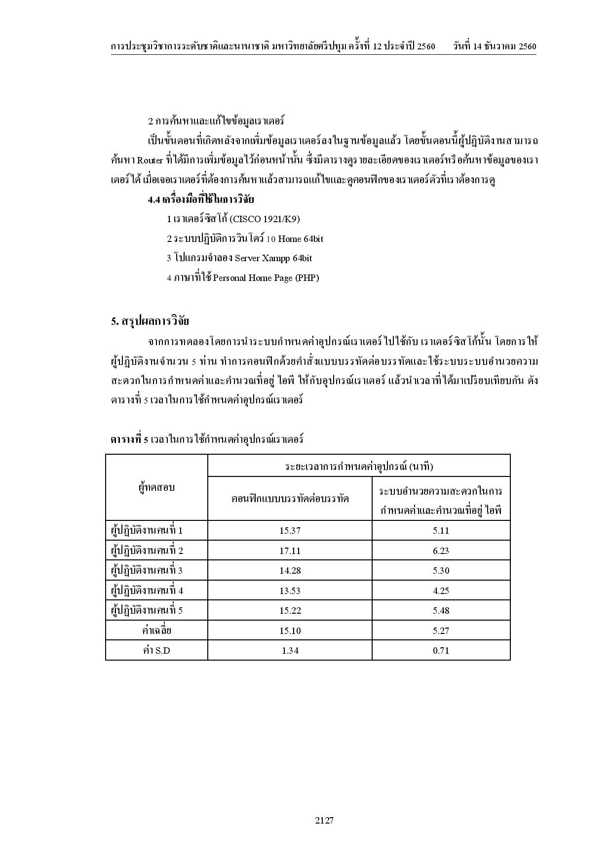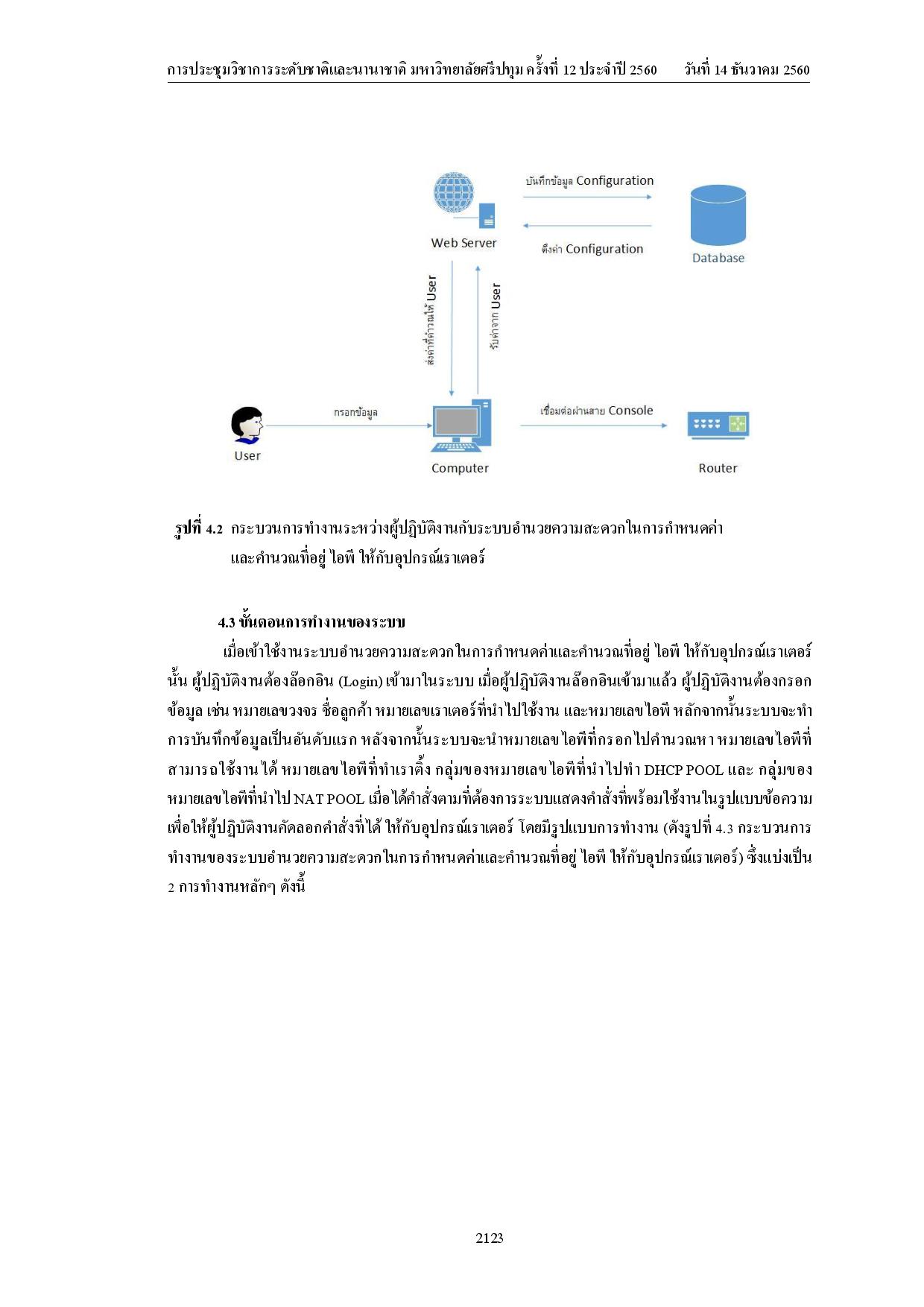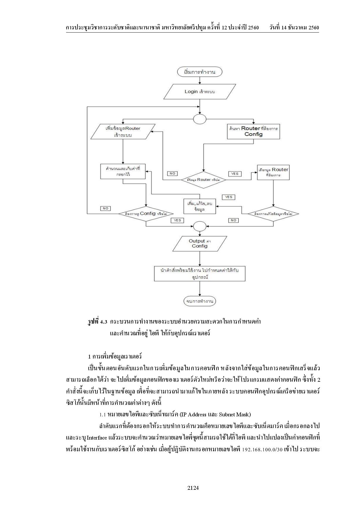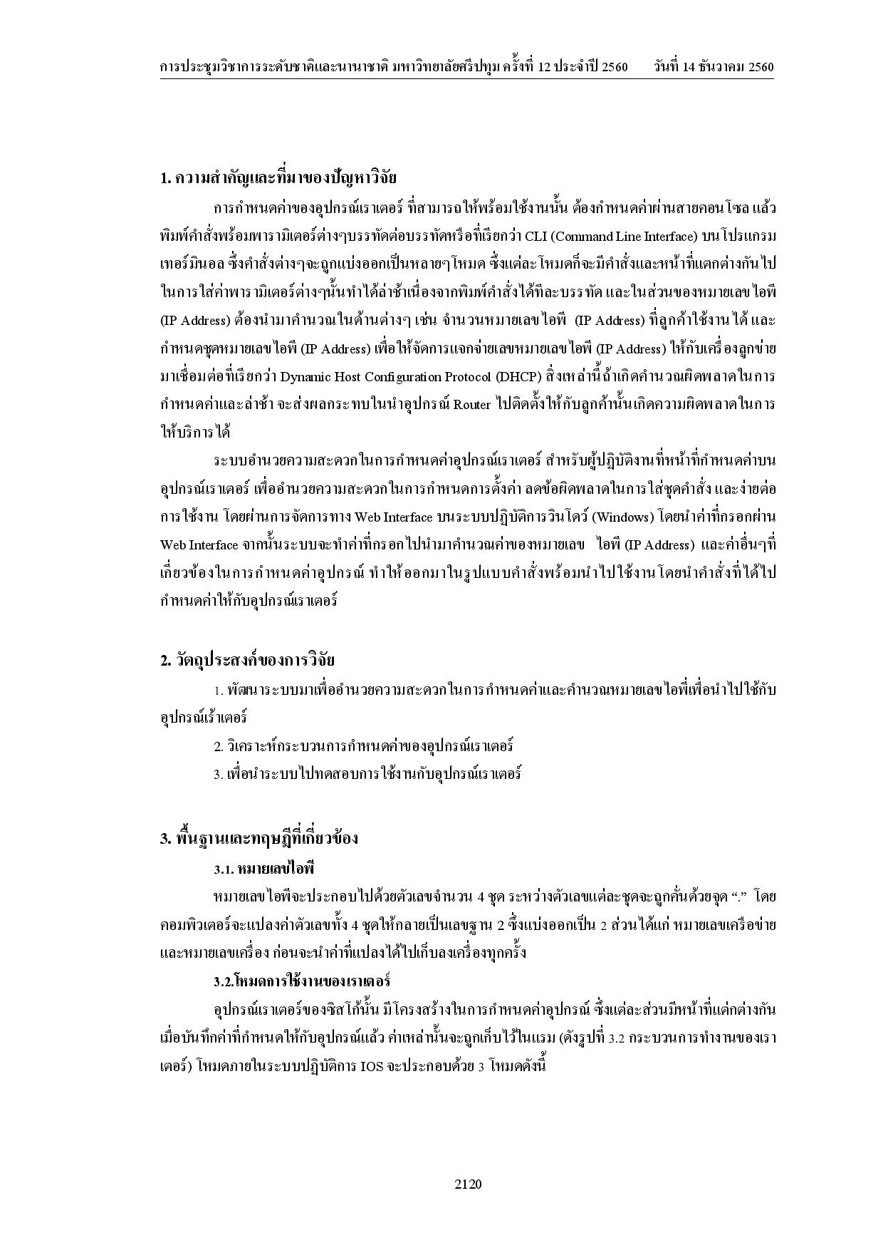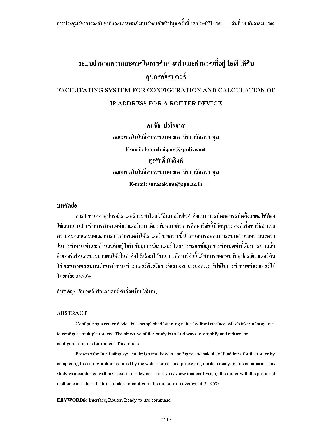 การกำหนดค่าอุปกรณ์เราเตอร์กระทำโดยใช้อินเทอร์เฟซคำสั่งแบบบรรทัดต่อบรรทัดซึ่งส่งผลให้ต้องใช้เวลานานสำหรับการกำหนดค่าเราเตอร์แบบเดียวกันหลายตัว การศึกษาวิจัยนี้มีวัตถุประสงค์เพื่อหาวิธีอำนวยความสะดวกและลดเวลาการการกำหนดค่าให้เราเตอร์ บทความนี้นำเสนอการออกแบบและพัฒนาระบบอำนวยความสะดวกในการกำหนดค่าและคำนวณที่อยู่ ไอพี กับอุปกรณ์เราเตอร์ โดยการกรอกข้อมูลการกำหนดค่าที่ต้องการผ่านเว็บอินเตอร์เฟสและประมวลผลให้เป็นคำสั่งใช้พร้อมใช้งาน การศึกษาวิจัยนี้ได้ทำการทดสอบกับอุปกรณ์เราเตอร์ซิสโก้ ผลการทดสอบพบว่าการกำหนดค่าเราเตอร์ด้วยวิธีการที่เสนอสามารถลดเวลาที่ใช้ในการกำหนดค่าเราเตอร์ได้โดยเฉลี่ย 83.59%