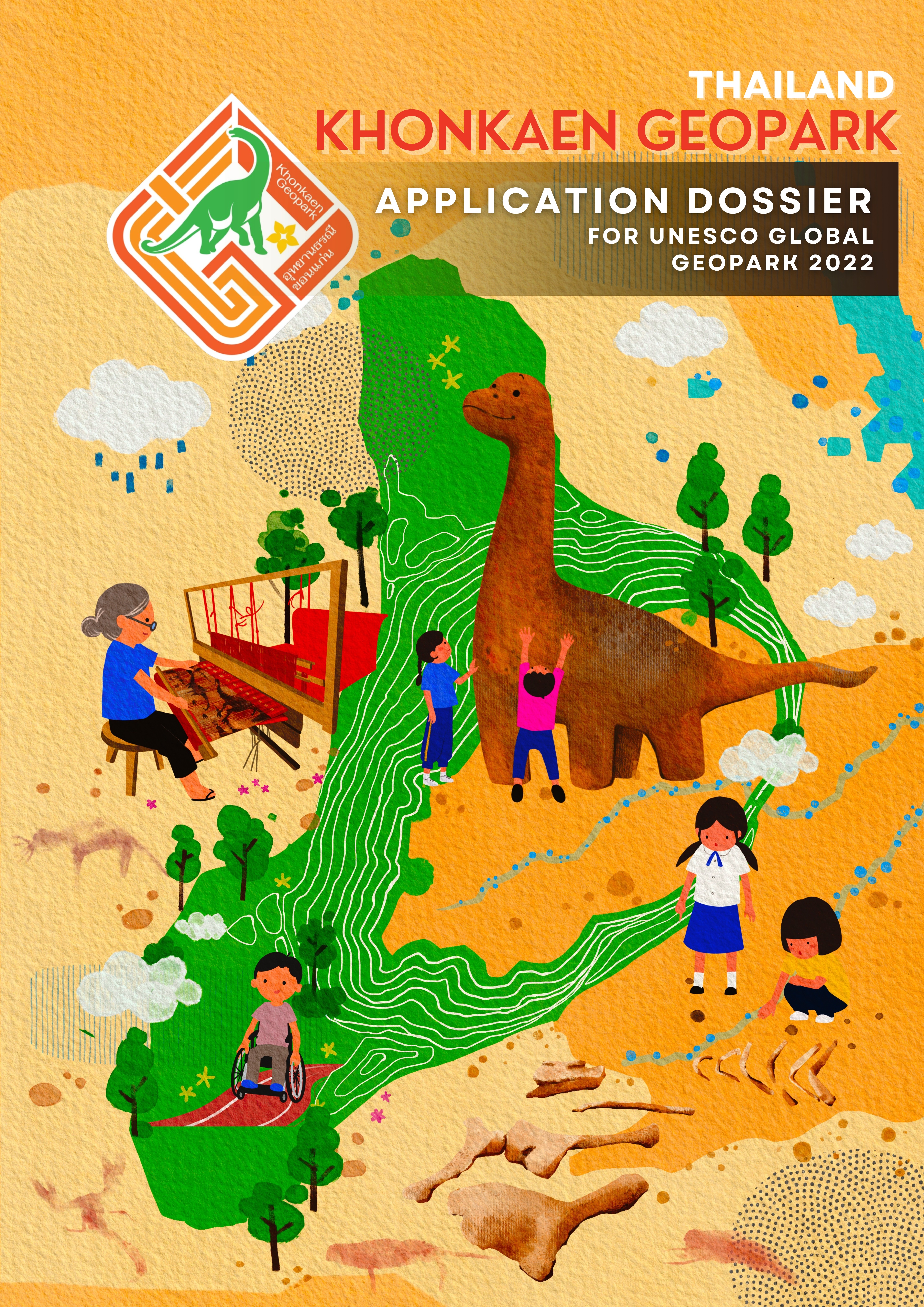 การสื่อสารอัตลักษณ์ของพื้นที่มรดกทางวัฒนธรรมและธรณีวิทยาให้เป็นที่ยอมรับในระดับสากล จำเป็นต้องอาศัยภาพประกอบที่มีประสิทธิภาพ งานวิจัยนี้มีวัตถุประสงค์เพื่อ (1) ศึกษาอัตลักษณ์ของอุทยานธรณีขอนแก่น ทั้งด้านธรณีวิทยา วัฒนธรรม และภูมิทัศน์ และ (2) ออกแบบภาพประกอบที่สามารถถ่ายทอดอัตลักษณ์ดังกล่าวได้อย่างมีประสิทธิภาพในระดับสากล โดยอาศัยการวิเคราะห์ข้อมูลร่วมกับทฤษฎีสัญศาสตร์และองค์ประกอบศิลป์ เพื่อนำเสนอองค์ประกอบสำคัญที่สะท้อนอัตลักษณ์ของพื้นที่ เช่น ฟอสซิลไดโนเสาร์ ภาพเขียนโบราณ ผ้าไหม และกิจกรรมชุมชน ผ่านแนวทางการลดทอนเนื้อหาและจัดองค์ประกอบให้ “พื้นที่” ทำหน้าที่เป็นตัวดำเนินเรื่อง ใช้เทคนิคจิตรกรรมดิจิทัล (Digital Painting) ด้วยแอปพลิเคชัน (Application) Procreate นำเสนอสาระสำคัญใน 3 ด้าน ได้แก่ ภูมิประเทศ ประวัติศาสตร์และวัฒนธรรม และความหลากหลายทางชีวภาพ ผลการประเมินจากกลุ่มตัวอย่างพบว่า ภาพประกอบสามารถสื่อความหมายได้อย่างชัดเจน มีความเหมาะสมในการเลือกใช้รูปแบบและองค์ประกอบทางศิลป์ อีกทั้งได้รับความพึงพอใจในด้านความสวยงาม สี รูปทรง และการจัดวาง ภาพประกอบที่พัฒนาขึ้นได้นำไปใช้จริงเป็นปกเอกสารประกอบการเสนอขอรับรองอุทยานธรณีโลกยูเนสโก และใช้ในการเผยแพร่และประชาสัมพันธ์อย่างกว้างขวาง ช่วยให้การสื่อสารอัตลักษณ์ของพื้นที่มีความชัดเจนยิ่งขึ้น และส่งเสริมการรับรู้ ความเข้าใจ และความสนใจในคุณค่าของอุทยานธรณีในวงกว้าง นอกจากนี้ ยังเกิดการต่อยอดไปสู่ลวดลายปักผ้าโดยมูลนิธิขอบฟ้ากว้างเพื่อบุคคลพิเศษ และมีศักยภาพในการพัฒนาเป็นผลิตภัณฑ์ส่งเสริมอาชีพอื่น ๆ ในอนาคต สะท้อนถึงพลังของงานออกแบบในการขับเคลื่อนอัตลักษณ์ของพื้นที่สู่ระดับสากล