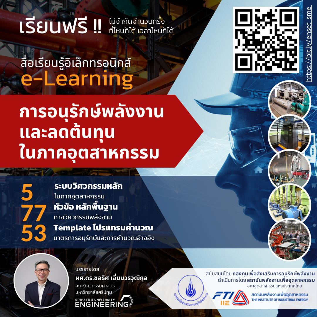 สื่อการเรียนรู้อิเล็กทรอนิกส์ (e-Learning) หัวข้อ การอนุรักษ์พลังงานและลดต้นทุนในภาคอุตสาหกรรม และ Template รายการคำนวณมาตรการอนุรักษ์พลังงาน สำหรับ 5 ระบบหลักในอุตสาหกรรมการผลิต ประกอบด้วย 1) ระบบปรับอากาศและการทำความเย็น 2) ระบบอัดอากาศ 3) ระบบไอน้ำและความร้อน 4) ระบบอุปกรณ์ไฟฟ้า 5) ระบบกระบวนการผลิต โดย ชุดสื่อการเรียนรู้ ประกอบด้วย 77 VDO คลิบหัวข้อย่อยพื้นฐานทางพลังงาน และ 53 Template โปรแกรมคำนวณ และ video อธิบายเนื้อหา โดยมีองค์ประกอบ ชุดวิดีโอเรียนรู้พื้นฐานการอนุรักษ์พลังงาน, ชุดวิดีโออธิบายการใช้ Template รายการคำนวณ, เอกสาร Slide ประกอบการเรียนรู้ Template, โปรแกรมรายการคำนวณมาตรการอนุรักษ์พลังงาน, และ แบบทดสอบ สำหรับทบทวนและประเมินผลการเรียนรู้